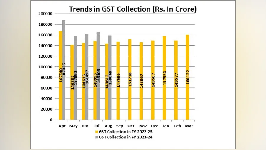 સરકારે પોતાની પ્રેસ રીલિઝમાં જણાવ્યું હતું કેઓગસ્ટ, 2023ના મહિનામાં એકત્રિત કરવામાં આવેલી ગ્રોસ GST આવક છે ₹1,59,069 કરોડ જેમાંથી CGST છે ₹28,328 કરોડ, SGST ₹35,794 કરોડ છે, IGST ₹83,251 કરોડ (માલસામાનની આયાત પર એકત્રિત કરવામાં આવેલા ₹43,550 કરોડ સહિત) છે અને સેસ ₹11,695 કરોડ (માલની આયાત પર એકઠા થયેલા ₹1,016 કરોડ સહિત) છે.