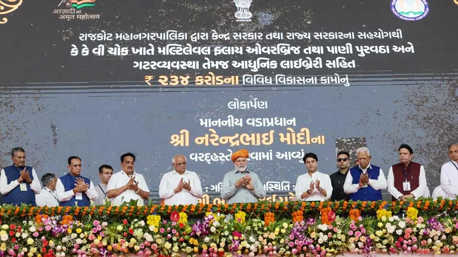 PM નરેન્દ્ર મોદીએ ગુજરાતનાં રાજકોટમાં રાજકોટ આંતરરાષ્ટ્રીય એરપોર્ટ અને રૂ. 860 કરોડથી વધારેનાં મૂલ્યનાં વિવિધ પ્રોજેક્ટનું લોકાર્પણ કર્યું હતું. આ પ્રોજેક્ટ્સમાં સૌની યોજના લિન્ક 3 પેકેજ 8 અને 9, દ્વારકા ગ્રામીણ પાણી પુરવઠા અને સ્વચ્છતા (આરડબલ્યુએસએસ)નું અપગ્રેડેશન, ઉપરકોટ કિલ્લાનાં પ્રથમ અને બીજા તબક્કાનું સંરક્ષણ, જીર્ણોદ્ધાર અને વિકાસ સામેલ છે. વોટર ટ્રીટમેન્ટ પ્લાન્ટ, સુએઝ ટ્રીટમેન્ટ પ્લાન્ટ અને ફ્લાયઓવર બ્રિજનું નિર્માણ. PMએ નવા ઉદ્ઘાટન પામેલા રાજકોટ આંતરરાષ્ટ્રીય એરપોર્ટના ટર્મિનલ બિલ્ડિંગની વોકથ્રુ પણ લીધી હતી.