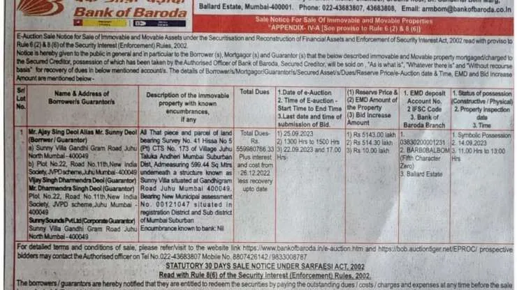 બેંક ઓફ બરોડાએ સની દેઓલની વિલાની હરાજી માટે અખબારોમાં જાહેરખબર પ્રસિદ્ધ કરાવી છે. સનીએ બેંક પાસેથી મોટી રકમની લોન લીધી હતી. આ લોન સનીએ મુંબઇના જુહૂ વિસ્તારમાં આવેલા પોતાની વિલા માટે લીધી હતી, જેનું નામ સની વિલા છે, જે મોર્ગેજ પર આપેલો છે.સની દેઓલે બેંકને 56 કરોડ રૂપિયાની રકમ ચૂકવવાની છે, જે હજુ સુધી તેણે ચુકવી નથી.