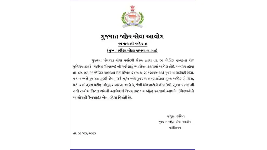 ગાંધીનગર ગુજરાત પંચાયત સેવા પસંદગી મંડળ દ્રારા એક નોટિફિકેશન બહાર પાડીને જાહેરાત કરવામાં આવી છે કે, 29 જાન્યુઆરી 2023 ના દિવસે જૂનિયર કલાર્ક ર્સ્પધાત્મક પરીક્ષા મોકુફ રાખવામાં આવી હતી તે પરીક્ષા હવે 9 એપ્રિલ 2023ના દિવસે સવારે 11થી 12 દરમિયાન લેવામાં આવશે.