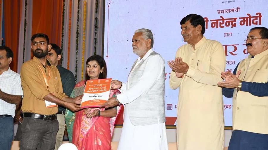 PM નરેન્દ્ર મોદીની વર્ચ્યુઅલ ઉપસ્થિતિમાં દેશના 71 હજારથી વધુ ઉમેદવારોને કેન્દ્રની સરકારી નોકરી માટેના નિમણુંક પત્ર વિતરણનો કાર્યક્રમ દેશના 45 સ્થળોએ યોજાયો હતો. આ શૃંખલા અન્વયે સૌરાષ્ટ્ર કક્ષાનો રોજગાર મેળો કેન્દ્રીય મંત્રી પુરુષોત્તમ રૂપાલાના અધ્યક્ષસ્થાને રાજકોટના જગજીવનરામ સીનીયર રેલવે ઇન્સ્ટિટ્યૂટ, કોઠી કમ્પાઉન્ડ ખાતે યોજાયો હતો. જેમાં PM નરેન્દ્ર મોદીના વક્તવ્યનું જીવંત પ્રસારણ કરાયું હતું. આ પ્રસંગે PM એ કહ્યું હતું કે દેશના યુવાનોને દરેક ક્ષેત્રે રોજગારી મળે તે માટે પ્રતિબધ્ધ કેન્દ્ર સરકારે અનેક પ્રયાસો કર્યા છે. જેના ભાગરૂપે લાખો યુવાનો રોજગારી મેળવી રહ્યા છે. અનેક ક્ષેત્રની કાયાપલટ કરી રોજગારીની તકો યુવાનો માટે નિર્માણ કરાઈ છે.
