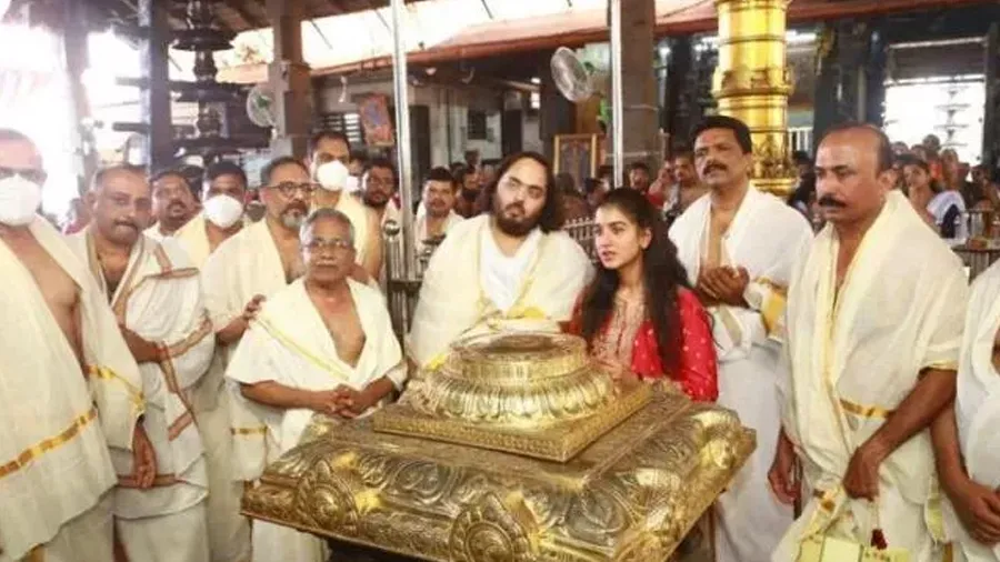 પોતાના લગ્ન પહેલા અનંત અંબાણી અને રાધિકા મર્ચન્ટે લાઈફની નવી શરૂઆત માટે સર્વશક્તિમાન પાસેથી આશિર્વાદ લેવા માટે કેરળના ગુરુવાયુર મંદિરની મુલાકાત લીધી હતી. તેમની આ યાત્રાના ફોટા અને વીડિયોઝ ઈન્ટરનેટ પર ઘણા વાયરલ થઈ રહ્યા છે. સામે આવેલા ફોટામાં અનંત અને રાધિકા મંદિર પરિસરની અંદર પૂજારીઓના એક સમૂહ સાથે ઊભેલા જોવા મળે છે. આ દરમિયાન જ્યાં અનંત પારંપારિક સફેદ અટાયરમાં હતો તો તેની મંગેતર રાધિકા ગોલ્ડન વર્કવાળા લાલ રંગના સૂટમાં ઘણી સુંદર લાગી રહી હતી.