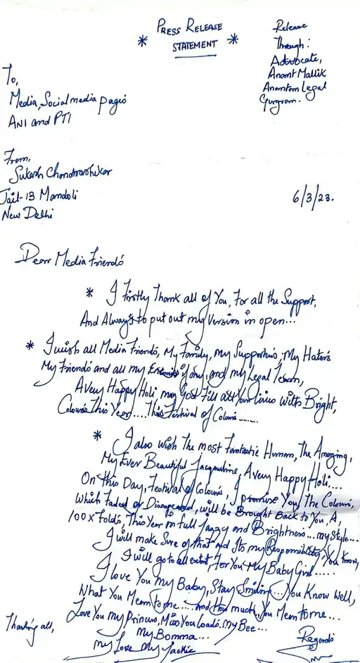 સુકેશે પરિવાર, સમર્થકો, ફ્રેન્ડ્સ, હેટર્સ, દુશ્મનો અને પોતાની લીગલ ટીમને હોળીની શુભકામનાઓ આપી. આ લેટર સુકેશે પોતાના એડવોકેટના માધ્યમથી મોકલ્યો છે. જેમા તેણે મંડોલી જેલનું એડ્રેસ લખ્યું છે. સુકેશે આ પહેલા વેલેન્ટાઇન ડે પર પણ જેકલીનને વિશ કર્યું હતું.