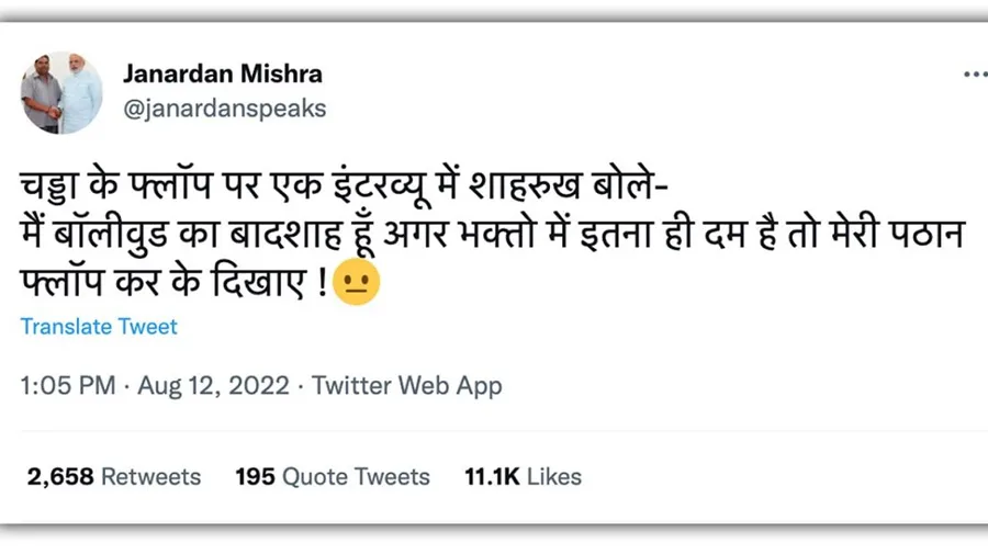 અમને ફિલ્મ લાલ સિંહ ચઢ્ઢાના બોક્સ ઓફિસ પરિણામો સાથે સંબંધિત શાહરૂખ ખાનનો કોઈ ઈન્ટરવ્યુ મળી શક્યો નથી જેમાં તે લોકોને તેની ફિલ્મ પઠાણ ફ્લોપ બનાવવા માટે પડકાર ફેંકે છે. શાહરૂખના સોશિયલ મીડિયા હેન્ડલ્સમાંથી પણ આવું કોઈ નિવેદન મળ્યું નથી.