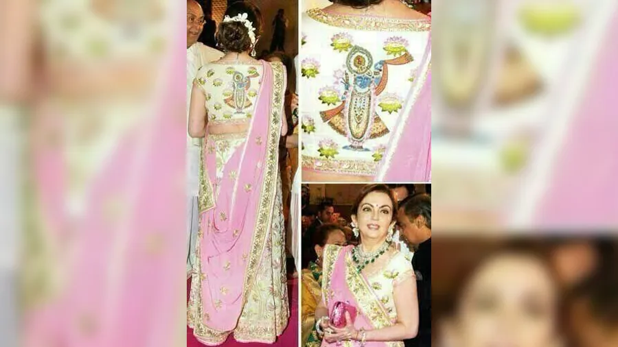 નીતા અંબાણીએ રિલાયન્સ ઈન્ડસ્ટ્રીઝ ગ્રુપના CEO પીરામલ નથવાનીના દીકરાના લગ્નમાં ચેન્નાઈથી સિલ્ક ડિરેક્ટર શિવાલિંગમ દ્વારા ડિઝાઈન કરવામાં આવેલી આ વિવાહ પાતુ સાડી પહેરી હતી. આ સાડીની સાથે ડિઝાઈનર બ્લાઉઝ પણ હતું, જેના પાછળના ભાગમાં શ્રીનાથજીની છબિ હતી. આ સાડી ફેમસ આર્ટિસ્ટ રાજા રવિ વર્માની પેઈન્ટિંગ રેપ્લિકા ડિઝાઈનના આધાર પર બનાવવામાં આવી હતી. સાડીમાં સોનાના તારોનું વર્ક હતું. સોના ઉપરાંત તેમાં એમરલ્ડ, રૂબી, પોખરાજ, પર્લ જેવા રત્નોનો પણ ઉપયોગ કરવામાં આવ્યો હતો. આ સાડીને ચેન્નાઈના કાંચીપુરમની 36 મહિલા કારીગરોએ બનાવી હતી. તેનું વજન 8 કિલો છે. તેને બનાવવામાં 1 વર્ષનો સમય લાગ્યો હતો. આ સાડીને સંપૂર્ણપણે હાથોથી બનાવવામાં આવી હતી. જેમાં મશીનનો ઉપયોગ કરવામાં નહોતો આવ્યો. આ જ કારણે આ સાડીને ગિનીસ બુક ઓફ વર્લ્ડ રેકોર્ડમાં સામેલ કરવામાં આવી છે. નીતા અંબાણીની આ સાડીની કિંમત આશરે 40 લાખ રૂપિયા છે.