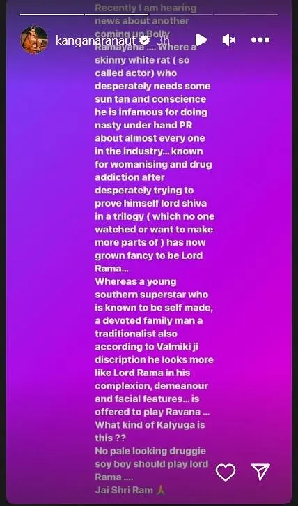 તેણે એમ પણ ઉમેર્યું, 'જ્યારે વાલ્મીકિજી દ્વારા વર્ણવ્યા પ્રમાણે એક યુવા દક્ષિણ સુપરસ્ટાર, જેને સ્વ-નિર્મિતના રૂપમાં ઓળખવામાં આવે છે, જે એક સમર્પિત પારિવારિક માણસ, પોતે એક પરંપરાવાદી પણ છે, તે તેના રંગ, રીતભાત અને ચહેરાના લક્ષણોમાં ભગવાન રામની જેવો દેખાય છે.... તે રાવણની ભૂમિકા ભજવશે... આ કેવો કલયુગ છે? કોઈ નિસ્તેજ દેખાતો, ડ્રગ એડિક્ટ છોકરાને ભગવાન રામનું પાત્ર ન ભજવે..., જય શ્રી રામ.' કંગનાએ પોતાની તે પછીની ઇન્સ્ટાગ્રામ સ્ટોરીમાં ખાતરનું નિશાન મૂક્યું છે. તેમાં તેણે એમ પણ કહ્યું, જો તમે મને એકવાર માર્યું તો, હું તમને ત્યાં સુધી મારીશ, જ્યાં સુધી તમે મરી નહિ જશો, મારી સાથે કોઈ હોશિયારી ન કરતા, દુર જ રહેજો!!!!' અહીં તમને જણાવી દઈએ કે, રણબીર ફિલ્મ બ્રહ્માસ્ત્રમાં શિવની ભૂમિકામાં જોવા મળ્યો હતો.