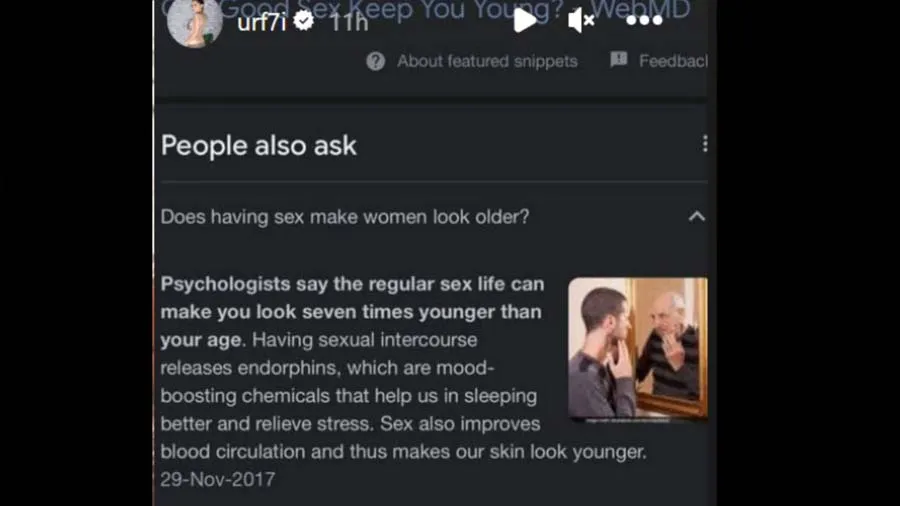આ સ્ક્રીનશોટ અનુસાર, સાઈકોલોજિસ્ટ્સ કહે છે, નિયમિતરીતે સેક્સ કરવાથી તમે પોતાની ઉંમર કરતા સાત ગણા નાના દેખાઈ શકો છો. સેક્સુઅલ ઈન્ટરકોર્સથી એન્ડોર્ફિન રીલિઝ થાય છે જે મૂડ સારું બનાવનારું કેમિકલ હોય છે જે સારી ઊંઘમાં પણ મદદ કરે છે અને સ્ટ્રેસમાં પણ તે રાહત અપાવે છે. સેક્સ કરવાથી બ્લ્ડ સર્કુલેશન વધે છે અને તેને કારણે તમારી સ્કિન યુવાન લાગે છે.