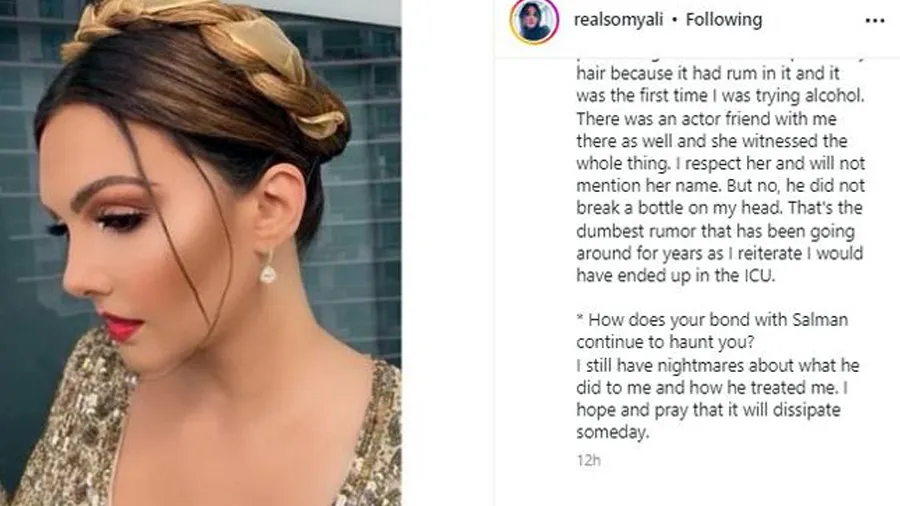સોમીએ ગુરુવારે ઘણી બધી પોસ્ટ લખીને સલમાન ખાન પર ગંભીર આરોપો લગાવ્યા છે. તેમાંથી એક પોસ્ટમાં સોમીએ એ ઘટના અંગેની સચ્ચાઈ બતાવી છે, જેમાં દાવો કરવામાં આવ્યો હતો કે સલમાન ખાને ગુસ્સામાં તેના માથા પર બોટલ ફોડી હતી. સોમી લખે છે- જો સલમાન ખાને મને બોટલ મારી હોતે તો હું સીધી હોસ્પિટલમાં પહોંચતે. સલમાન ખાને થમ્સ અપનો ગ્લાસ મારા વાળ ઉપર નાખ્યો હતો કારણ કે તેમાં રમ મિક્સ કરેલી હતી.