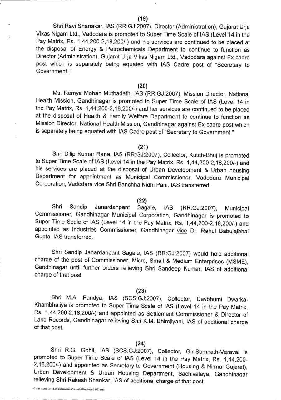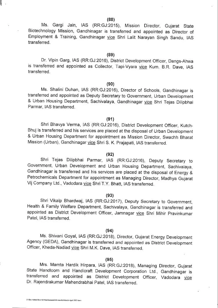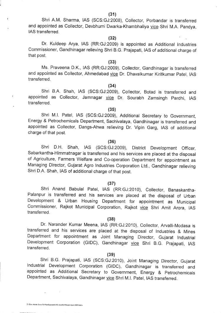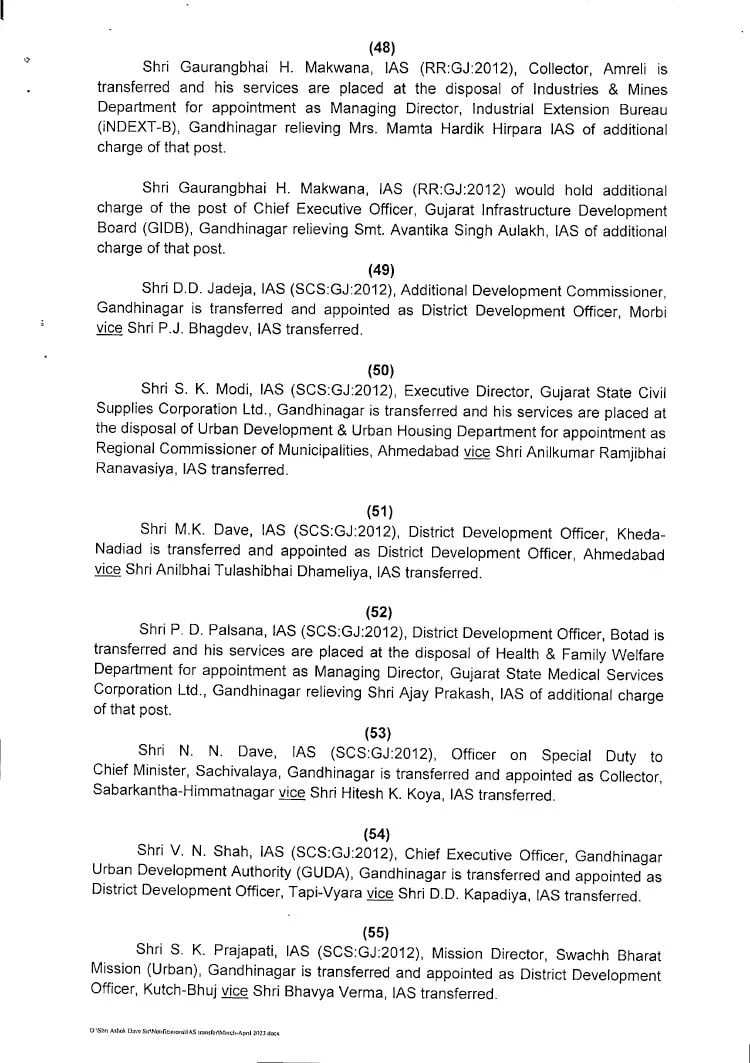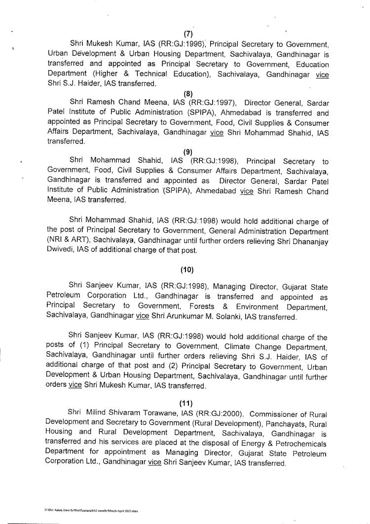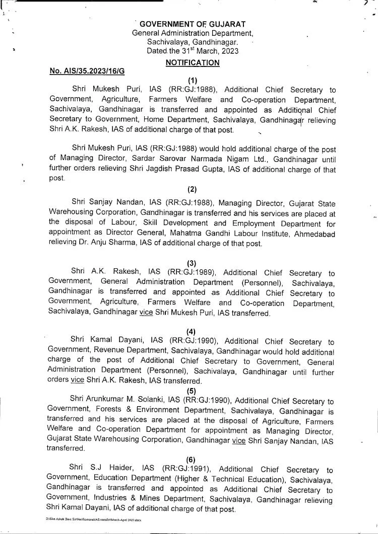 મુકેશ પુરી, એકે રાકેશ, કમલ દયાની, અરુણ સોલંકી, મુકેશ કુમાર, રમેશચંદ્ર મીણા સહિતના અધિકારીઓની બદલી કરવામાં આવી છે. આ ઉપરાંત મોહમ્મદ શાહિદ, સંજીવ કુમાર, રૂપવંત સિંગ, બચ્છાનિધિ પાની, હર્ષદ પટેલ, આલોક પાંડે સહિત ઘણા સિનિયર અધિકારીઓની બદલી કરવામાં આવી છે.