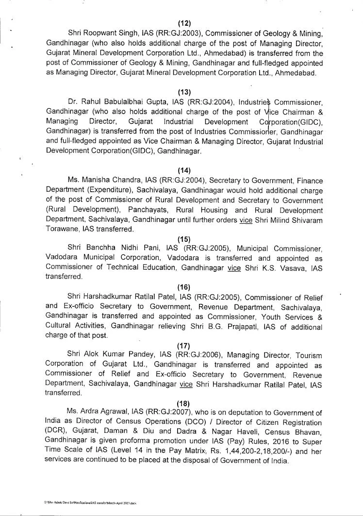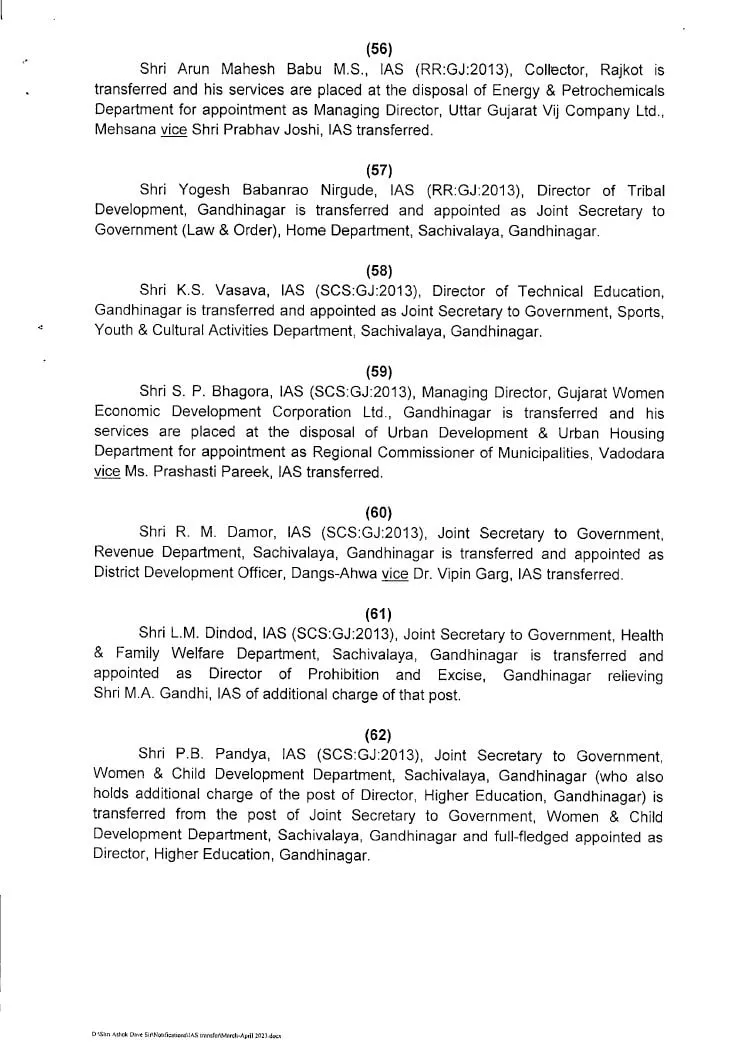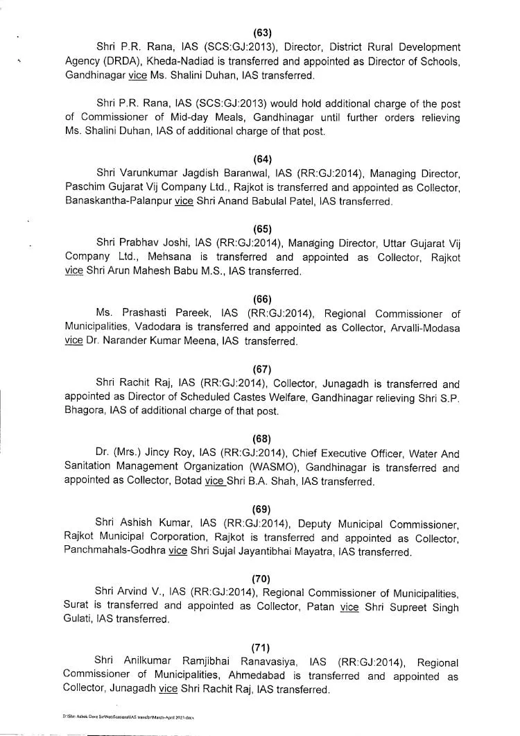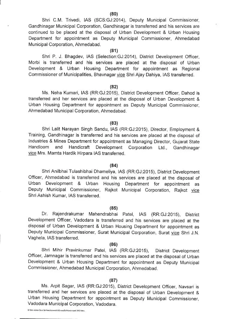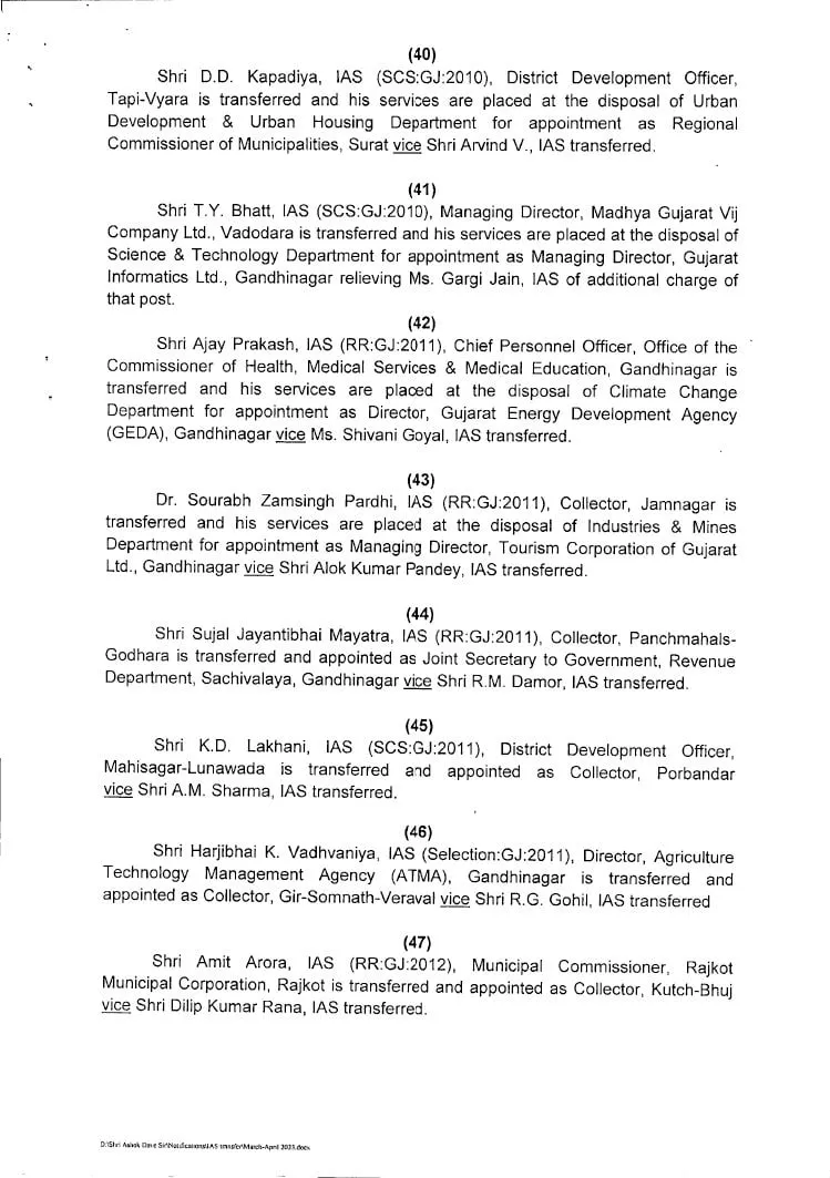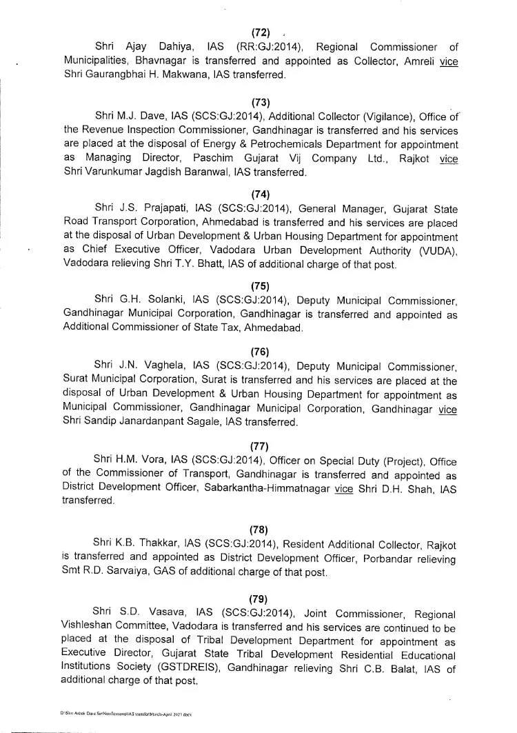 મુકેશ પુરી, એકે રાકેશ, કમલ દયાની, અરુણ સોલંકી, મુકેશ કુમાર, રમેશચંદ્ર મીણા સહિતના અધિકારીઓની બદલી કરવામાં આવી છે. આ ઉપરાંત મોહમ્મદ શાહિદ, સંજીવ કુમાર, રૂપવંત સિંગ, બચ્છાનિધિ પાની, હર્ષદ પટેલ, આલોક પાંડે સહિત ઘણા સિનિયર અધિકારીઓની બદલી કરવામાં આવી છે.