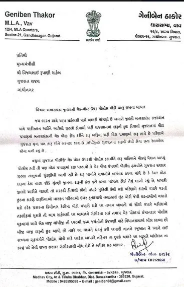 ગેનબેન ઠાકોરે તેમના પત્રના જણાવ્યું છે કે, 'જય ભારત સાથે જણાવવાનું કે, આપની પાસેથી અમારી માંગણી છે કે, અમારો જિલ્લો બનાસકાંઠા રાજસ્થાન અને પાકિસ્તાનને અડીને આવેલો જિલ્લો છે. રાજસ્થાનમાં દારુની છૂટ હોવાથી ગુજરાતમાં બનાસકાંઠાની ચેકપોસ્ટ ક્રોસ કરીને દારુ માફિયા મોટા પ્રમાણમાં દારુ લાવે છે, પરિણામે ગુજરાતનું યુવા ધન દારુ પીને બરબાદ થાય છે. ગાંધીજીના ગુજરાતમાં દારૂ બંધી હોવા છતાં પણ રેલમછેલ જોવા મળી રહી છે.
