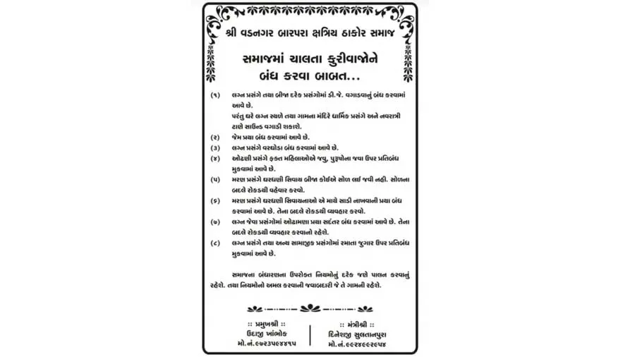 વડનગર બારપરા ક્ષત્રિય ઠાકોર સમાજે જે નિર્ણયો લીધા છે. તેમાં લગ્ન પ્રસંગોએ કે અન્ય શુભ પ્રસંગોએ ડીજે વગાડી શકાશે નહીં. નવરાત્રી વખતે સાઉન્ડ વગાડી શકાશે,લગ્ન પ્રસંગે વરઘોડા પર પ્રતિબંધ મુકવામાં આવ્યો છે.ઓઢણી પ્રસંગે માત્ર મહિલાઓએ જ જવું, પુરુષોને જવા પર પ્રતિબંધ. મરણ પ્રસંગે સોળ લઇ જવાની પ્રથા પર પ્રતિબંધ. લગ્નમાં ઓઢમણા પ્રથા પર પ્રતિબંધ મુકી દેવામાં આવ્યો છે. લગ્ન પ્રસંગોમાં જુગાર રમવા પર પ્રતિબંધ.
