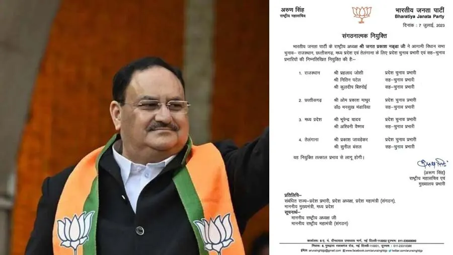 ભાજપના રાષ્ટ્રીય અધ્યક્ષ જે પી નડ્ડાએ આગામી વિધાનસભાનીચૂંટણી માટે રાજસ્થાન, મધ્ય પ્રદેશ, છત્તીસગઢ અને તેલંગાણામાં પ્રભારી અને સહપ્રભારીની જાહેરાત કરી છે.