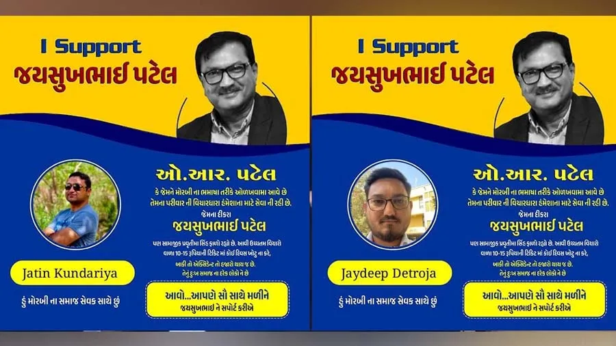 સોશિયલ મીડિયામાં હાલ કેટલાક પોસ્ટરો વાયરલ થઇ રહ્યા છે. જેમાં લખ્યું છે કે, ‘ઓ.આર. પટેલ જેમને મોરબીના ભમાષા તરીકે ઓળખવામાં આવે છે, તેમના પરિવારની વિચારધારા હંમેશાં સેવાની રહી છે. તેમના દીકરા જયસુખ પટેલનો સામાજિક પ્રવૃત્તિમાં સિંહફાળો રહ્યો છે. આવા ઉચ્ચતમ વિચારોવાળા 10-15 રૂપિયાની ટિકિટમાં કોઇ દિવસ ખોટું ના કરે. બાકી તો અકસ્માત તો હજારો થાય જ છે. તેનું દુઃખ સમાજના દરેક લોકોને છે. આવો સાથે મળીને જયસુખભાઇને સપોર્ટ કરીએ. આવા લખાણ સાથે જે તે વ્યક્તિનો ફોટો અને તેની નીચે હું મોરબીના સમાજ સેવક સાથે છું તેવું લખાણ છે.’