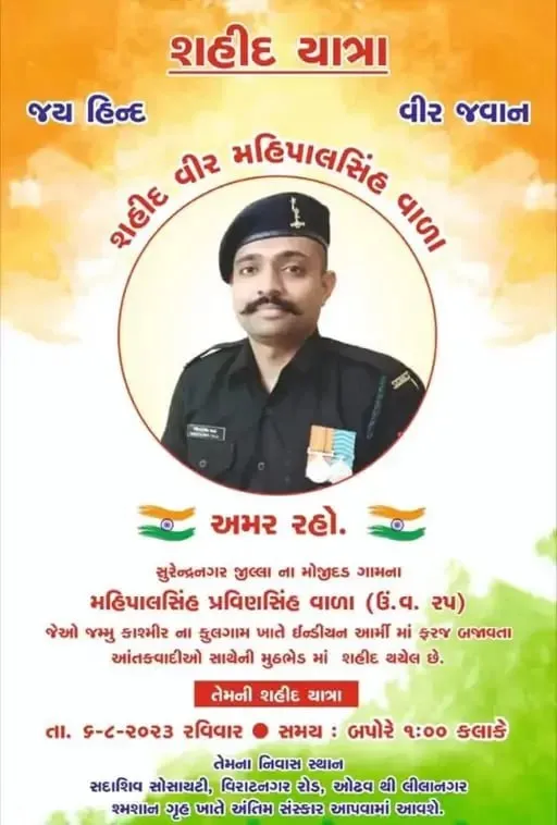 મુળ સુરેન્દ્રનગરના મોજીદડ ગામના અને અત્યારે અમદાવાદના વિરાટ નગરમાં રહેતા મહિપાલ સિંહ વાળા જમ્મૂ-કશ્મીરના કુલગામમાં આતંકવાદીઓ સાથેની મૂઠભેડમાં શહીદ થઇ ગયા હતા. તેમની ઉમર માત્ર 25 વર્ષની હતી અને તેમના પત્ની ગર્ભવતી છે, મહિપાલ સિંહ પિતા તરીકે ખુશી મેળવે તે પહેલા આતંકવાદીઓની ગોળીએ આ વીર જવાનની ખુશી છીનવી લીધી હતી. દેશની સુરક્ષા માટે ગુજરાતી જવાને પોતાની જાન ન્યોછાવર કરી દીધી હતી.