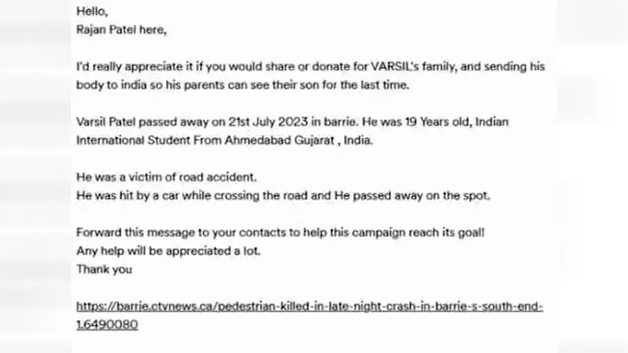 વર્ષિલ પટેલના મિત્ર રાજન પટેલેGoFundMe નામની વેબસાઇટ પર વિનંતી કરતો એક પત્ર લખ્યો છે. એમાં લખવામાં આવ્યું છે કે વર્ષિલના પરિવારને થોડું દાન આપશો તો તેને ઘણો ટેકો મળશે. કેનેડાના બેરીમાં વર્ષિલનું 21 જુલાઇએ રોડ એક્સિડન્ટમાં મોત થયું છે. તેના મૃતદેહને ભારત મોકલવા માટે લગભગ 30,000 ડોલરનો ખર્ચ આવી શકે છે. આ માટે મિત્રોએ ભેગા થઇને ક્રાઉડ ફડીંગ શરૂ કર્યું છે. અત્યાર સુધીમાં 21,177 કેનેડિયન ડોલર ભેગા થઇ ચૂક્યા છે, હજુ નવેક હજાર ડોલરની જરૂર છે.