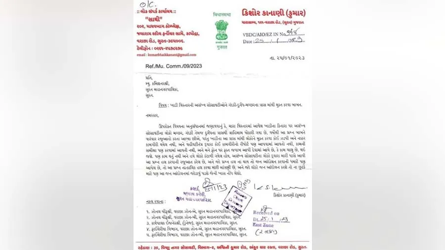 વરાછાના ધારાસભ્ય કુમાર કાનાણીએ સુરત મહાનગર પાલિકાના કમિશ્નરને 25 જાન્યુઆરી 2023ના દિવસે એક પત્ર લખ્યો હતો. કુમાર કાનાણીએ પત્રમાં લખ્યું હતું કે, મારા વિસ્તારમાં આવેલા ખાડી કિનારા પરની અનેક સોસાયટીઓમાં ગંદકી અને મચ્છરન ઉપદ્રવ છે. આ વિસ્તારના લોકો ખાડીની સમસ્યાથી ભારે પરેશાન છે. જો આ સમસ્યાનો તાત્કાલિક ઉકેલ નહીં આવે તો પ્રજા આંદોલન કરશે.