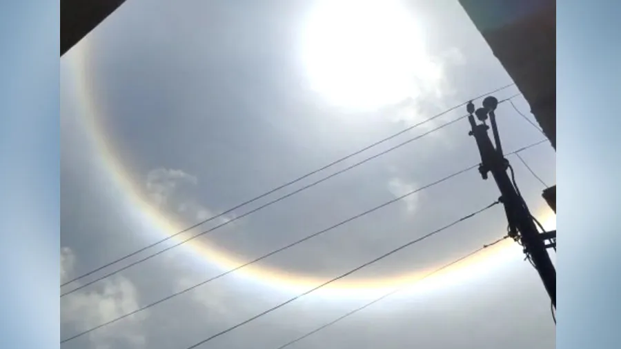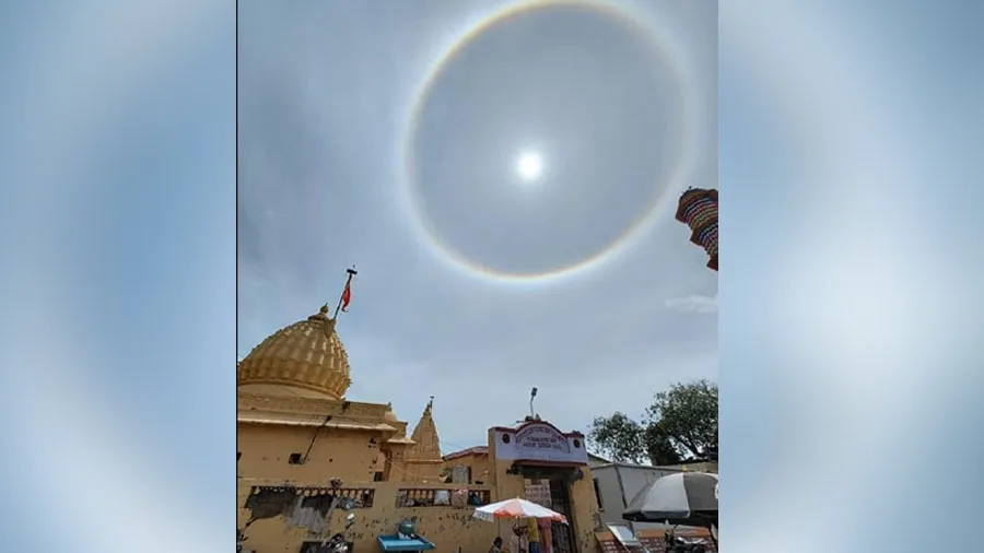 ગીર સોમનાથ જિલ્લા પંથકના આકાશમાં સૂર્યની ફરતે રંગબેરંગી વલય (સર્કલ) જોવા મળતા લોકો આશ્ચર્યચકિત થયા હતા. જો કે, આ વાત વાયુવેગે સમગ્ર પંથકમાં પ્રસરી ગઈ હતી. જેને કારણે લોકો કુતૂહલવશ થઈને ઘરની બહાર નીકળી આકાશમાં જોઈ રહ્યા હતા અને આકાશમાં જોવા મળી રહેલ અદભુત ખગોળીય ઘટના નિહાળી રોમાંચિત થઈ રહ્યા હતા. જો કે, આ રંગબેરંગી સર્કલ ગીર સોમનાથ પંથકના આકાશમાં સૂર્યની ફરતે ઘણો સમય સુધી સર્જાયેલું જોવા મળ્યું હતું. ત્યારે આ ખગોળીય ઘટનાને લઈને અનેક લોકોના મનમાં પ્રશ્ન પણ ઉઠી રહ્યો છે કે, આ રંગબેરંગી સર્કલ કેમ બન્યું હશે. આમ આ સમગ્ર ઘટનાને લઈને લોકોમાં અનેક પ્રકારની ચર્ચાઓ પણ થઈ રહી હતી.