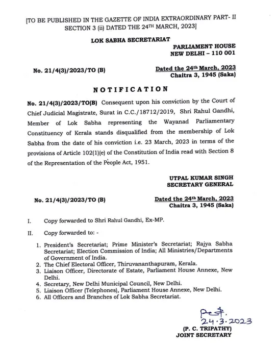 માનહાનિ કેસમાં દોષિ સાબિત થયેલા કોંગ્રેસ સાંસદ રાહુલ ગાંધીને મોટો ઝટકો મળ્યો છે. લોકસભાના સ્પીકરે રાહુલ ગાંધીની સંસદનું સભ્યપદ રદ્દ કરી દીધું છે. રાહુલ ગાંધીને લોકસભામાંથી અયોગ્ય જાહેર કરી દેવામાં આવ્યા છે. આના માટે લોકસભામાંથી નોટિફિકેશન પણ બહાર પાડી દેવામાં આવ્યું છે, જેમાં લખવામાં આવ્યું છે કે, સુરતના ચીફ જ્યુશિયલ મેજિસ્ટ્રેટે રાહુલ ગાંધીને દોષિ જાહેર કર્યા છે, જેને કારણે રાહુલ ગાંધીને કેરળની વાયનાડ સીટ પરથી ડિસક્વોલિફાઇ જાહેર કરવામાં આવે છે. તેમની સદસ્યતા 23 માર્ચ 2023થી રદ્દ ગણવામાં આવશે.