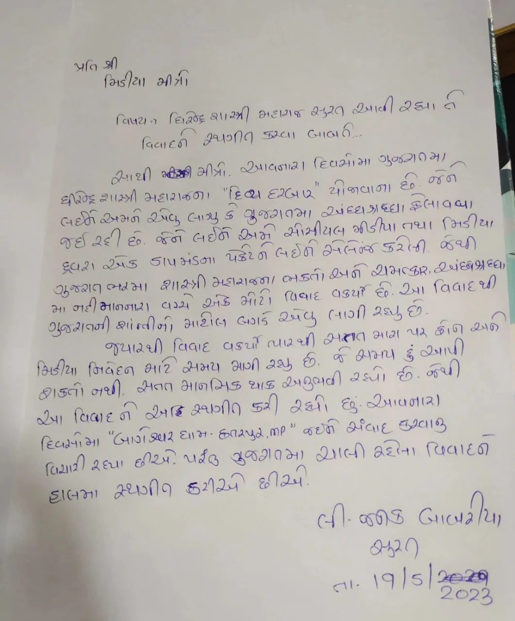 તેમણે કહ્યું કે, જરૂર પડશે તો હું મધ્ય પ્રદેશ જઇને બાગેશ્વર ધામના પંડિત ધીરેન્દ્ર શાસ્ત્રી સાથે સંવાદ કરી આવીશ. પરંતુ અત્યારે આ વિવાદને હું સ્થિગત કરી રહ્યો છું.