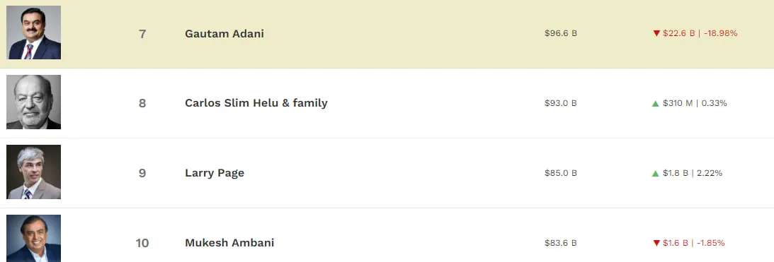 ફોર્બ્સના રિયલ ટાઈમ બિલિયોનેર્સ ઈન્ડેક્સ અનુસાર, ગૌતમ અદાણી ટોપ-10 બિલિયોનેર્સના લિસ્ટમાં ચોથા નંબર પરથી નીચે સરકીને સાતમાં નંબર પર આવી ગયા હતા. આ ઉલટફેરમાં લાંબા સમય સુધી ગૌતમ અદાણીથી નીચે રહેલા વોરન બફેટ, બિલ ગેટ્સ અને લેરી એલિસન તેમની ઉપર નીકળી ગયા. ટોચના અબજોપતિઓના લિસ્ટમાં જે બદલાવ આવ્યો છે તે અનુસાર, ટોપ-10માં પહેલા નંબર પર 215 અબજ ડૉલર નેટવર્થ સાથે ફ્રાન્સના અરબપતિ બર્નાર્ડ આર્નોલ્ટ દુનિયાના સૌથી ધનવાન વ્યક્તિ બની ગયા છે. બીજા નંબર પર ટેસ્લા CEO એલન મસ્ક 170.1 અબજ ડૉલર સાથે રહેલા છે. અમેઝોનના કો-ફાઉન્ડર જેફ બેજોસ 122.4 અબજ ડૉલર નેટવર્થ સાથે દુનિયાના ત્રીજા સૌથી ધનવાન વ્યક્તિ છે.