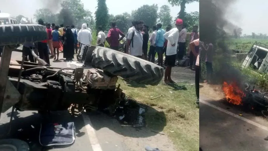 ટક્કર એટલી જોરદાર થઇ હતી કે ધમાકા સાથે ટ્રેક્ટરના બે ટુકડા થઇ ગયા હતા અને એક હિસ્સો પાછળ આવી રહેલી ચાંદની બાઇક સાથે અથડાયો. ટક્કર લાગતાની સાથે જ બાઇક સવાર ચારે લોકો ઉછળીને સડક પર પડી ગયા અને મોકા પર જ ચારેના મોત થઇ ગયા. ટેક્સી અને ટ્રેક્ટર ચાલક ઘટના સ્થળ પરથી ભાગી ગયા. બીજી બાજુ ઘટના બાદ બાઇક પણ સળગી ઉઠી. પોલીસે મૃતદેહોને એકત્ર કરીને એમ્બ્યુલન્સની મદદથી પલિયા મોકલાવ્યા.