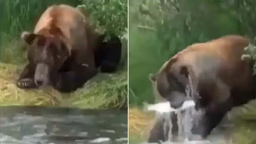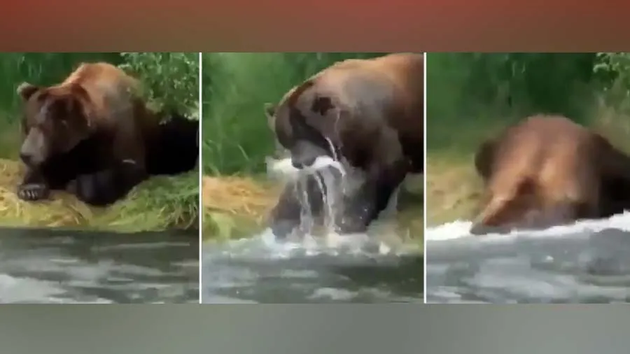 આ વીડિયોમાં એક કદાવર રીંછ નદી કિનારે શાંતિથી બેઠેલો નજરે પડે છે, એનું ધ્યાન પાણી તરફ છે. પાણીમાં તરતી માછલીઓને આ રીંછ જોઇ રહ્યો છે. લાંબા સમયની વોચ પછી રીંછ એકાએક પાણીમાં હુમલો કરી દે છે અને તેના મોંઢામાં એક મોટી માછલી જોવા મળી રહી છે.