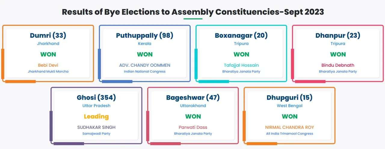 અહી તેમના ઉમેદવાર ચાંડી ઓમાને લેફ્ટના જેક થૉમસને 37 હજાર વૉટના મોટા અંતરથી હરાવ્યા. માનવામાં આવી રહ્યું છે કે કોંગ્રેસ ઉમેદવારને પોતાના પિતા અને સીનિયર નેતા ઓમાન ચાંડીના નિધનના કારણે સહનુભૂતિનો ફાયદો પણ મળ્યો છે. ઉત્તર પ્રદેશમાં પછાતોની રાજનીતિનું કેન્દ્ર બનેલી ઘોસી સીટ પર અખિલેશ યાદવને સફળતા મળી છે. સપાના ઉમેદવાર સુધાકર સિંહે ભાજપના દારા સિંહ ચૌહાણને હરાવી દીધા છે.