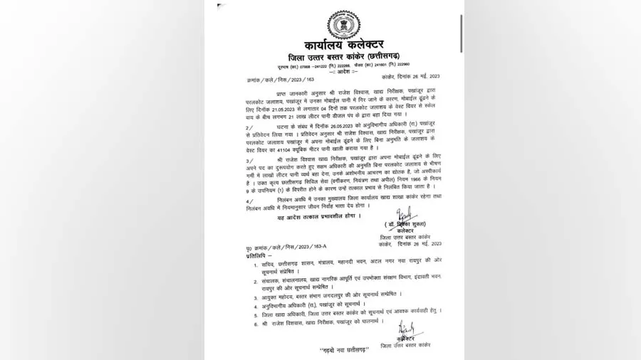 બીજી તરફ, શુક્રવારે જ્યારે મામલો સામે આવ્યો ત કાંકેજ જિલ્લાના કલેક્ટર પ્રિયંકા શુક્લાએ આ સંબંધમાં રિપોર્ટ માંગ્યો અને રાજેશને સસ્પેન્ડ કરી દીધો. કલેક્ટર શુક્લાએ જળ સંશાધન વિભાગના એસડીઓ આરસી ધીવરને જેમની બહારના વિસ્તારમાંથી પાણી કાઢવાની મૌખિક પરવાનગી આપવા બદલ કારણ દર્શાવો નોટિસ જાહેર કરી દીધી છે. સસ્પેન્ડના આદેશ અનુસાર, વિશ્વાસે પરલકોટ જળાશયના વેસ્ટ વેરમાંથી આશરે 4104 ક્યૂબિક મીટર એટલે કે 41 લાખ લીટર પાણી ડિઝલ પંપ વડે વહાવી દીધુ.
