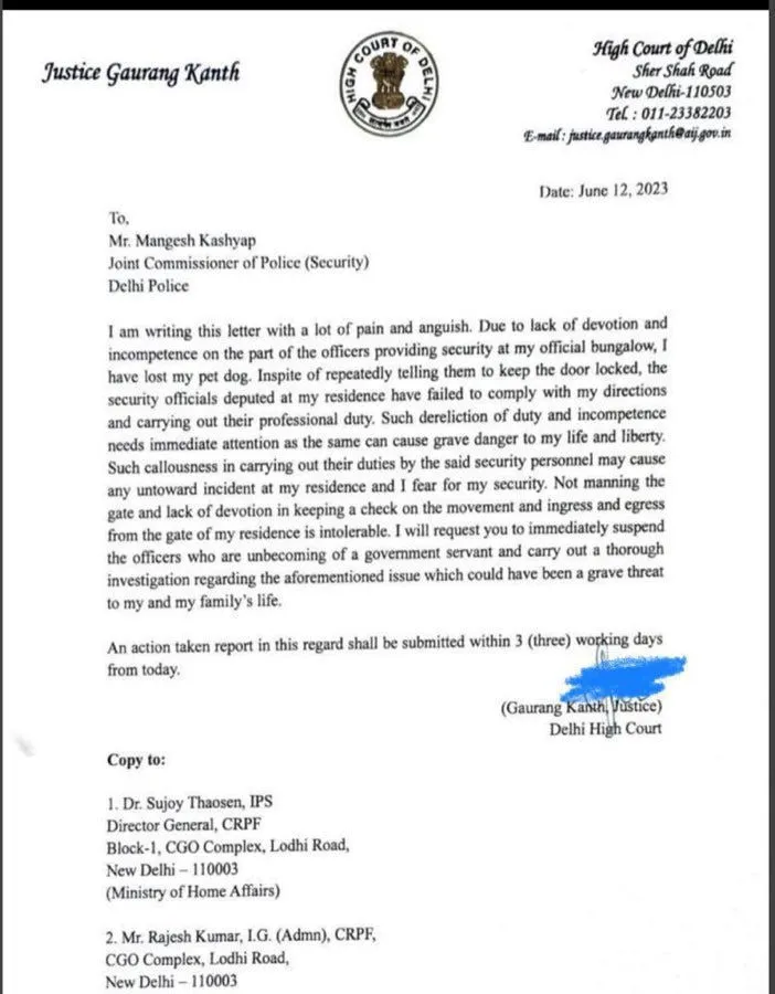 દિલ્હી હાઇ કોર્ટના એક જજે પોતાના આવાસ પર તૈનાત દિલ્હી પોલીસના એક કર્મચારીના સસ્પેન્શનની માગ કરી હતી. તેના માટે તેમણે રીતસરના જવાબદાર અધિકારીને ચિઠ્ઠી લખી હતી. તેમનો આરોપ હતો કે, પોલીસકર્મીઓએ વારંવાર કહેવા છતા તેમના બંગ્લાના દરવાજા બંધ ન કર્યા. જેના કારણે તેમણે પોતાનો પાળતું કૂતરો ગુમાવી દીધો. આ ચિઠ્ઠી સોશિયલ મીડિયા પર વાયરલ થઈ ગઈ હતી. હવે તેમણે પોલીસકર્મીના સસ્પેન્શનની માગ પરત લઈ લીધી છે. એક અંગ્રેજી અખબારના રિપોર્ટ મુજબ, ન્યાયાધીશ ગૌરાંગ કાંઠે દિલ્હી પોલીસના સંયુક્ત પોલીસ કમિશનર (સુરક્ષા)ને 12 જૂનના રોજ ચિઠ્ઠી લખી હતી.