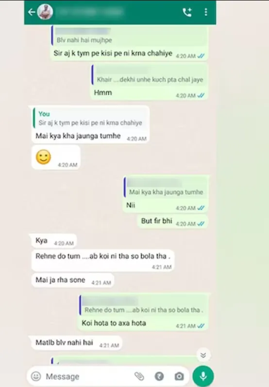 ઈન્સ્પેક્ટર શુભમ સિંહે રાત્રે 3 વાગે યુવતીને વોટ્સએપ મેસેજ મોકલ્યો. જેમાં તેણે લખ્યું હતું કે 'હું ઘરે એકલો છું, તમે મારા ઘરે આવી જાઓ', તેના પર યુવતીએ કહ્યું કે, મારા ઘરે બધા સૂઈ રહ્યા છે, તે યોગ્ય નથી. પછી ઈન્સ્પેક્ટરે કહ્યું એક કપ ચા પી લે જે. છોકરીએ કહ્યું, આ સારી વાત નથી, હું નહિ આવી શકું, તો ઈન્સ્પેક્ટરે કહ્યું, અરે હું તને ખાઈ થોડો જઈશ. તમે આવી જાઓ મારા ઘરે, મારા મહોલ્લામાં બધા સૂઈ ગયા છે. હવે તો ઊંઘ પણ નથી આવી રહી. તમે અહીં આવી જાઓ રૂમ પર વાતો કરીએ. બસ મને તારી સાથે વાત કરવાનું મન થાય છે.