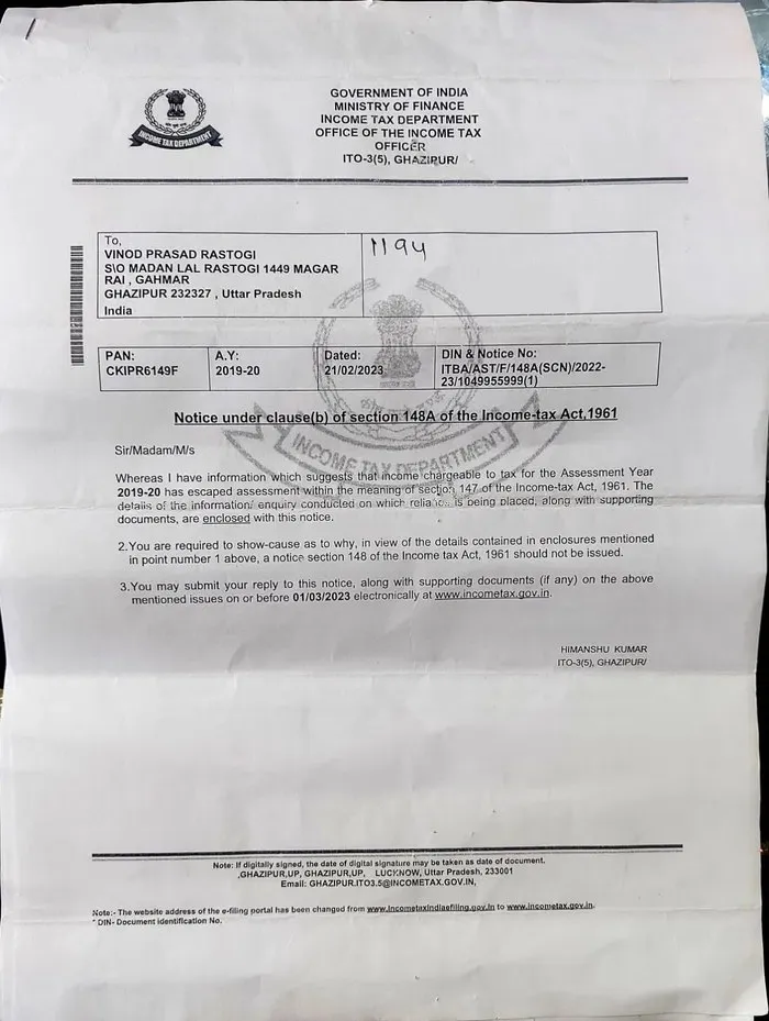 લગભગ છ મહિના પહેલા, મગરરાવ પટ્ટીના રહેવાસી વિનોદ રસ્તોગીને આવકવેરા વિભાગ, વારાણસી તરફથી નોટિસ મળી હતી. નોટિસ અનુસાર, તેમના યુનિયન બેંક ખાતામાં 172.81 કરોડ રૂપિયા છે અને તેનો ટેક્સ ચૂકવવામાં આવ્યો નથી.