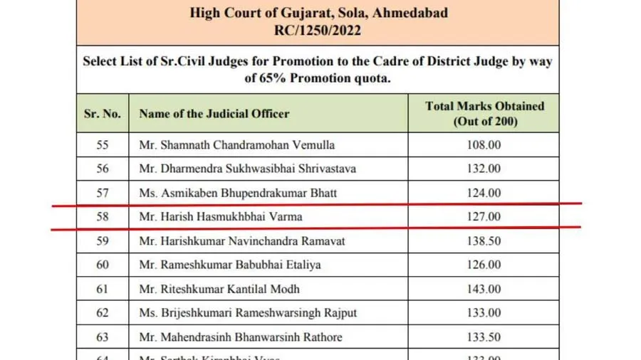 હરિશભાઈ હસમુખભાઇ વર્માની વાત કરીએ તો તેમને 200 માર્ક્સની પરીક્ષામાં 127 પોઇન્ટ્સ મળ્યા હતા અને સીનિયર સિવિલ જજમાંથી ડિસ્ટ્રિક્ટ જજ કેડરમાં પ્રમોશન યોગ્ય સાબિત થયા હતા. ધ્યાન આપવા જેવી વાત એ છે કે, માર્ચવાળી નોટિફિકેશનથી લગભગ અઢી મહિના અગાઉ 29 ડિસેમ્બર 2022ના રોજ જાહેર કરવામાં આવેલી ગેઝેટ નોટિફિકેશન મુજબ, હરીશ હસમુખભાઇ વર્માને એડિશનલ સીનિયર સિવિલ જજ અને એડિશનલ ચીફ જ્યૂડિશલ મેજિસ્ટ્રેટમાંથી ચીફ જ્યૂડિશલ મેજિસ્ટ્રેટ અને એડિશનલ સીનિયર સિવિલ જજ તરીકે પ્રમોટ કરવામાં આવ્યા હતા.