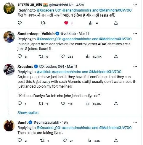 તેના પર સુંદરદીપ નામના ટ્વિટર યુઝરે કહ્યું, 'ભારતમાં એડપ્ટિવ ક્રૂઝ કંટ્રોલ સિવાય ADASના અન્ય ફીચર્સ મજાક બની ગયા છે.' સુમિત લખે છે, 'આવી રીલ્સ કોઈને મારી નાખશે.' અમિતે કહ્યું, 'ડ્રાઈવર પર કાર્યવાહી થવી જોઈએ.' અન્ય એક યુઝરે લખ્યું, 'ટેક્નોલોજીનો તદ્દન ખોટો ઉપયોગ.'