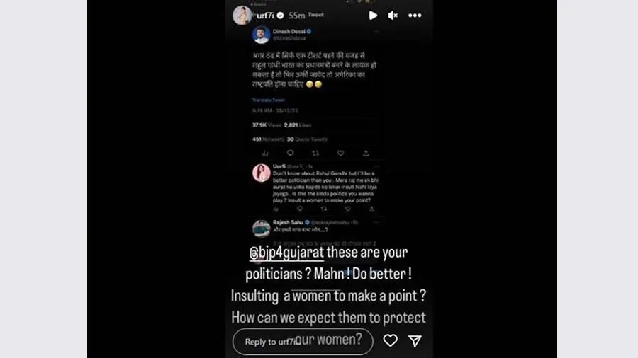 હવે એ શક્ય નથી કે કોઈ ઉર્ફી જાવેદનો ઉલ્લેખ કરે અને તે ચૂપ રહે. ઉર્ફી જાવેદે BJP કાર્યકરને રાહુલ ગાંધી સાથે તેની સરખામણી કરતાં તેની આકરી ટીકા કરી છે. તેની ઇન્સ્ટાગ્રામ સ્ટોરી પર નેતાની ટ્વીટ શેર કરતા ઉર્ફીએ લખ્યું, 'આ તમારા રાજનેતા છે? કંઈક સારું કરો તમારી વાત સાબિત કરવા માટે તમે એક સ્ત્રીનું અપમાન કરી રહ્યા છો? આપણે આ લોકો પાસેથી કેવી રીતે આશા રાખી શકીએ કે તેઓ આપણી સ્ત્રીઓની સુરક્ષા કરશે? ઉર્ફી જાવેદે તેની બીજી એક સ્ટોરીમાં એ પણ કહ્યું કે, તે કોઈપણ રાજકીય પક્ષને સમર્થન નથી કરતી.