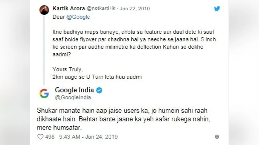 કોઈપણ ફરિયાદને ગૂગલ હળવાશથી નથી લેતું. દરેક ટ્વીટનો જવાબ જરૂરથી આપે છે. ગૂગલે આ ટ્વીટનો શાયરાના અંદાજમાં જવાબ આપતાં લખ્યું, ‘આભાર માનીએ છે તમારા જેવા યુઝર્સનો, જે અમને સાચો રસ્તો બતાવે છે. બહેતર બનાવતા જવાનો આ સફર અટકશે નહીં, મારા હમસફર.’