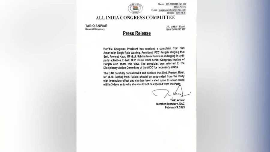 કેપ્ટન અમરિંદર સિંહની પત્ની પરનીત કૌર પટિયાલાથી હાલ સાંસદ છે. ભલે કેપ્ટન અમરિંદર સિંહે કોંગ્રેસ સાથે છેડો ફાડી BJP સાથે હાથ મિલાવ્યા હોય, પરંતુ પરનીત કૌરે ક્યારેય તેના પર પ્રતિક્રિયા નથી આપી. હવે PPCCના પ્રધાન રાજા વડિંગે કોંગ્રેસને પરનીત કૌરની પાર્ટી વિરોધી ગતિવિધીઓની ફરિયાદ મોકલી છે. જેના પર કાર્યવાહી કરતા પરનીત કૌરને પાર્ટીએ સસ્પેન્ડ કરી દીધા છે અને ત્રણ દિવસનો સમય જવાબ આપવા માટે આપ્યો છે.