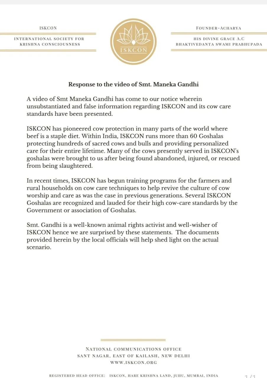 ઈસ્કોન દ્વારા બહાર પાડવામાં આવેલા નિવેદનમાં કહેવામાં આવ્યું છે કે, ઈસ્કોને દુનિયાના ઘણાં ભાગોમાં ગાય સંરક્ષણનો બેડો ઉઠાવ્યો છે. જ્યાં ગૌમાંસ એક મુખ્ય આહાર છે. તે સ્થાનો પર પણ ઈસ્કોન કામ કરી રહ્યું છે. શ્રીમતી ગાંધી એક પ્રસિદ્ધ પશુ અધિકાર કાર્યકર્તા અને ઈસ્કોનના શુભચિંતક છે. માટે અમે આ નિવેદનોથી આશ્ચર્યમાં છે.