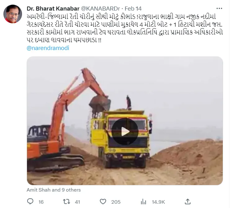 અમરેલી જિલ્લામાંથી મસમોટા રેતીચોરી કૌભાંડનો પર્દાફાશ થયા બાદ અમરેલી જિલ્લા ભાજપના પૂર્વ પ્રમુખ અને ભાજપના નેતા ડો. ભરત કાનાબારે આજે બપોરે 12 વાગ્યે પીએમ મોદીને ટેગ કરી એક ટ્વીટ કર્યું હતું. જેમાં ભાક્ષી ગામ પાસેથી ઝડપાયેલા રેતીચોરીના કૌભાંડને જિલ્લાનું સૌથી મોટું કૌભાંડ ગણાવ્યું હતું અને સાથે લખ્યું હતું કે,સરકારી કામોમાં ભાગો રાખવાની ટેવ ધરાવતા લોકપ્રતિનિધિ દ્વારા પ્રામાણિક અધિકારીઓ પર દબાણ લાવવાના ધમપછાડા.