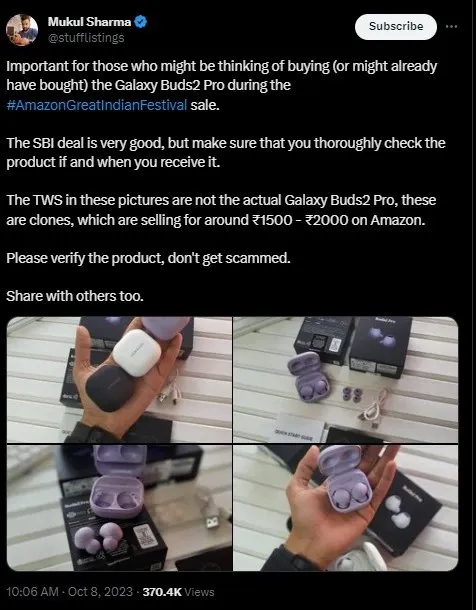 વાત અહીં પૂરી નથી થતી. કેટલાક અન્ય વપરાશકર્તાઓએ સોશિયલ મીડિયા પ્લેટફોર્મ X પર પોસ્ટ કર્યું છે કે, તેમને નકલી ઉત્પાદનો મોકલવામાં આવ્યા છે. અહીં તમને જણાવી દઈએ કે, Samsung Galaxy Buds 2 Pro અત્યારે એમેઝોન પર 6,491 રૂપિયામાં ઉપલબ્ધ છે. તમે તેને SBI ક્રેડિટ કાર્ડ પેમેન્ટ દ્વારા ડિસ્કાઉન્ટ પર ખરીદી શકશો.