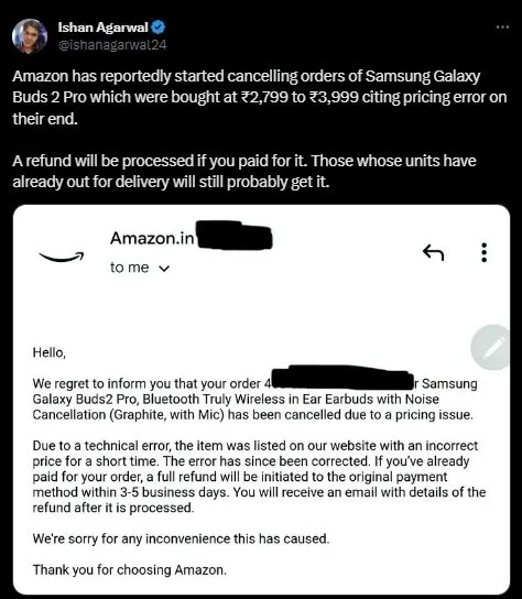 ફેસ્ટિવ સેલ દરમિયાન, યુઝર્સે 8,099 રૂપિયાના ડિસ્કાઉન્ટ પર Galaxy Buds 2 Proનો ઓર્ડર આપ્યો હતો. આ ડિસ્કાઉન્ટ SBI કાર્ડનો ઉપયોગ કરવા પર ઉપલબ્ધ હતું. આ પછી ઉપકરણની અંતિમ કિંમત ત્રણ હજાર રૂપિયાથી ઓછી થઈ ગઈ. એમેઝોને પાછળથી ગ્રાહકોના ઓર્ડર રદ કર્યા.