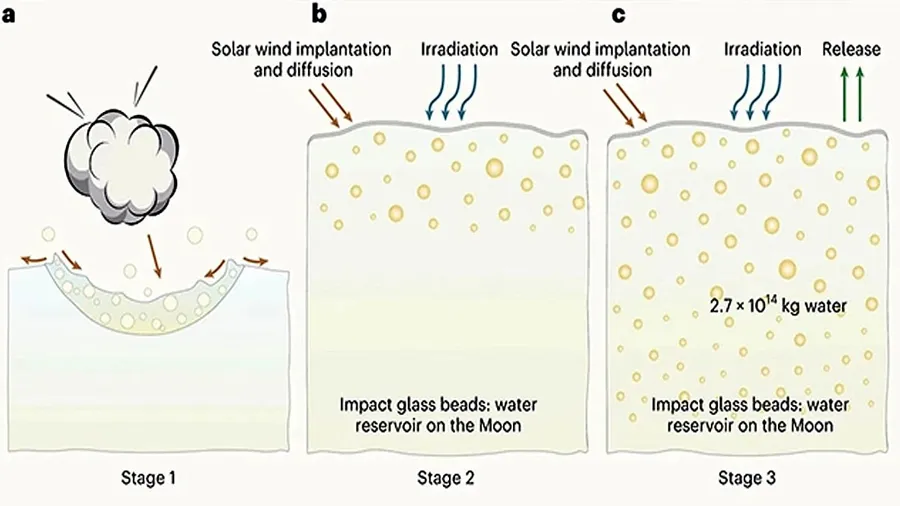 અહીં લગભગ 30 હજાર લીટર પાણી છે, તેનો રિપોર્ટ 27 માર્ચ 2023ના રોજ Nature Geosciences જર્નલમાં પ્રકાશિત થયો છે. આ કાંચના મોતીઓને ગ્લાસ સ્ફેરુલ્સ કે ઇમ્પેક્ટ ગ્લાસિસ કે માઇક્રોટેક્ટાઈટિસ કહેવામાં આવે છે. એ ત્યારે બને છે જ્યારે લાખો કિલોમીટર પ્રતિ કલાકની સ્પીડથી ઉલ્કાપિંડ ચંદ્ર સાથે ટકરાય છે. ચંદ્રયાન વાયુમંડળમાં માટી ઝડપથી ઊડે છે. અહી ટક્કરથી ખૂબ ગરમી ઉત્પન્ન થાય છે. જેથી સિલિકેટ ખનીજ પીગળે છે. પછી ઠંડા થઈને કાંચના ગોળ મોતીઓમાં બદલાઈ જાય છે.