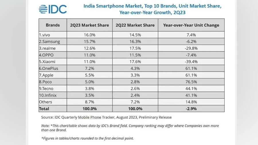 આ પીરિયડ દરમિયાન કંપનીની શિપમેન્ટમાં 7.4 ટકાનો વધારો દેખાડ્યો. ICDના રિપોર્ટમાં બીજા રેન્ક પર કોરિયન કંપની સેમસંગ ઉપસ્થિત છે. આ વર્ષે બીજા ક્વાર્ટરમાં કંપનીના શેર 15.7 ટકાના રહ્યા છે, જ્યારે ગયા વર્ષે આ ક્વાર્ટરમાં સેમસંગના માર્કેટ શેર 16.3 ટકાનો હતો. ત્રીજા નંબર પર Realme બ્રાન્ડ છે. આ વર્ષના બીજા ત્રિમાસિકમાં રિયલમીના માર્કેટ શેર 12.6 ટકા છે. જ્યારે માર્કેટ શેર 11 ટકા છે, જ્યારે ગયા વર્ષે આ ક્વાર્ટરમાં કંપની માર્કેટ શેર 11.5 ટકા હતા.