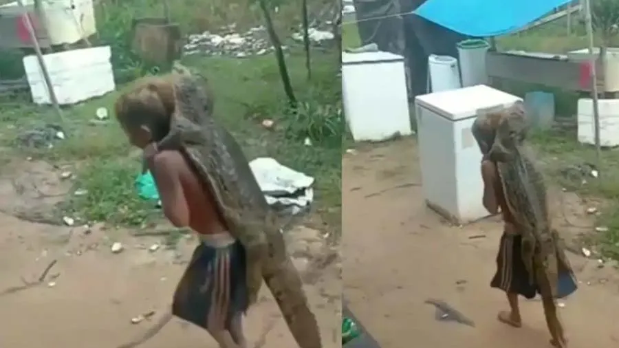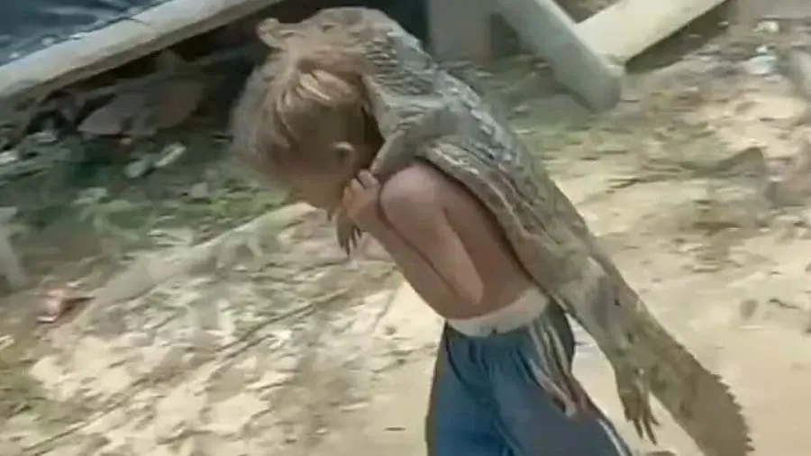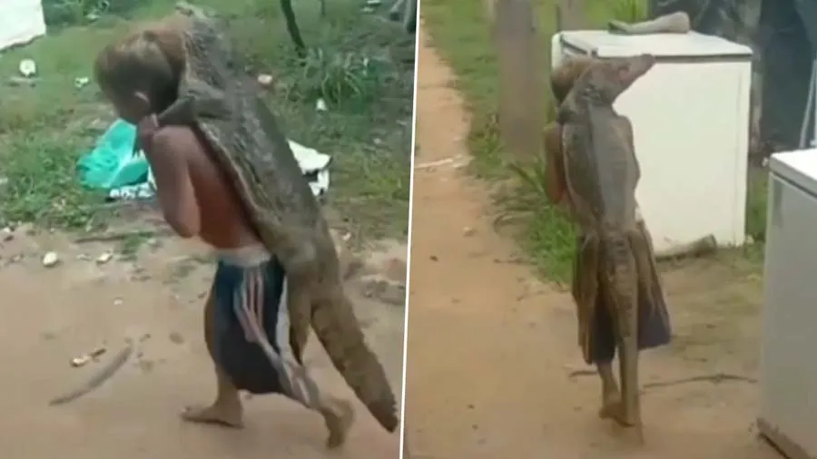 પીઠ પર મગર લઈને મસ્તીમાં ચાલતો બાળક જોવા મળ્યો, વીડિયો જોઈને રુંવાટા ઉભા થઇ જશે