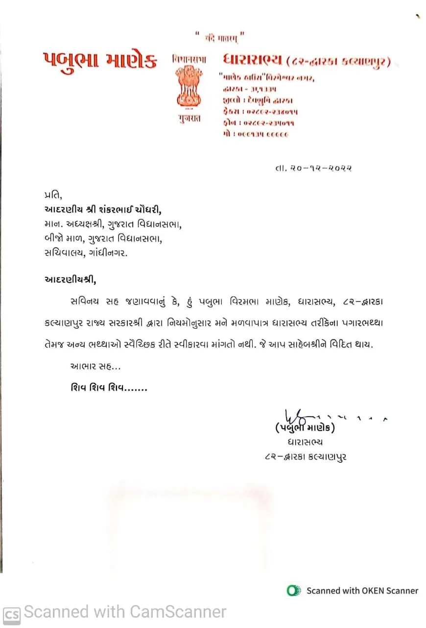 દ્રારકાના ભાજપના ધારાસભ્ય અને દંબગ, બાહુબલી નેતાની ઇમેજ ધરાવતા પબુભા માણેકે ગુજરાત વિધાનસભા અધ્યક્ષ શંકર ચૌધરીને પત્ર લખીને જાણ કરી છે કે તેઓ પગાર અને સરકારી ભથ્થાનો સ્વીકાર કરશે નહીં. અગાઉ કેટલાંક ધારાસભ્યોએ પણ આવો નિર્ણય લીધો હતો.પબુભામા નિર્ણયને ચારેકોરથી આવકાર મળી રહ્યો છે.