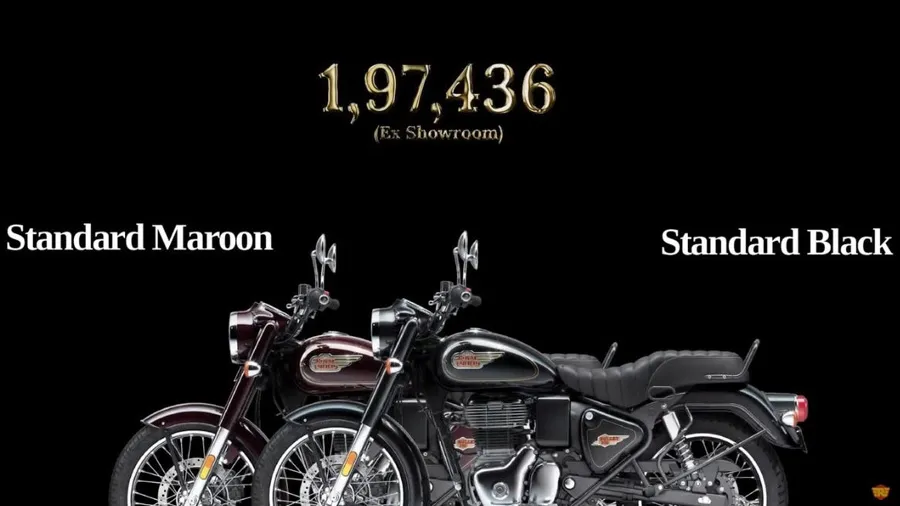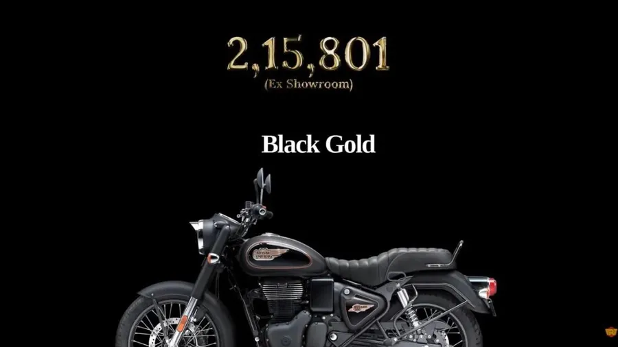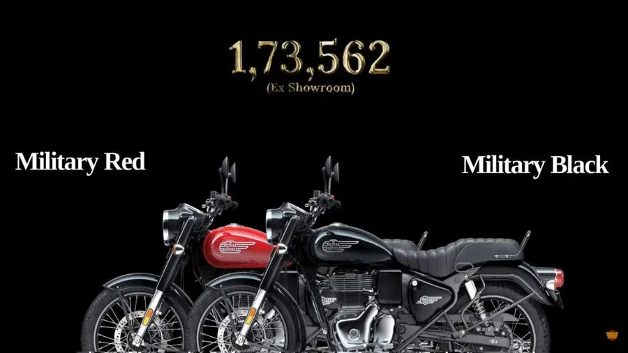 2023 રોયલ એનફીલ્ડ Bullet 350 ને 3 લાઇનઅપ વેરિયન્ટ્સ- મિલિટ્રી, સ્ટાન્ડર્ડ અને બ્લેક ગોલ્ડમાં લોન્ચ કરવામાં આવી છે. જેમની કિંમત એક્સ શોરૂમ ક્રમશઃ 1,73,562 રૂપિયા, 1,97,436 રૂપિયા અને 2,15,801 રૂપિયા છે. કંપનીએ મિલિટ્રી વેરિયન્ટ્સમાં બે કલર ઓપ્શન આપ્યા છે. તો ગોલ્ડમાં એક અને સ્ટાન્ડર્ડમાં ેબે કલર ઓપ્શન આપ્યા છે.