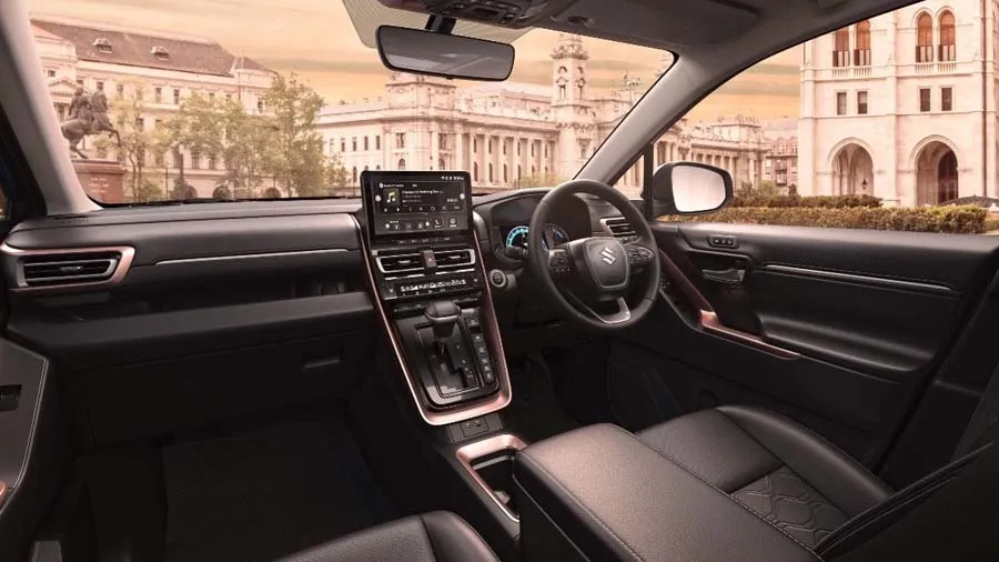 તેની કેબિન ઘણી હદ સુધી Innova જેવી જ છે. Maruti Invictoમાં નવા 10.1 ઇંચના ફ્રી-સ્ટેન્ડિંગ ટચસ્ક્રીન ઇન્ફોટેન્મેન્ટ સિસ્ટમ આપવામાં આવી છે જે વાયરલેસ એપ્પલ કાર પ્લે અને એન્ડ્રોઇડ ઓટોને સપોર્ટ કરે છે. આ ઉપરાંત, ચોરસ એર કંડિશનર વેન્ટ્સ આપવામાં આવ્યા છે. આ કારને 360 ડિગ્રી કેમેરા, ડિજિટલ ઇન્સ્ટ્રુમેન્ટ ક્લસ્ટર, પેડલ શિફ્ટર, વેન્ટિલેટેડ ફ્રન્ટ સીટ, પાવર ફ્રન્ટ સીટ્સ, એમ્બીએન્ટ લાઇટિંગ, પાવર્ડ ટેલગેટ, પેનોરમિક સનરૂફ, લેધર સીટ્સ જેવા ફીચર્સ પણ મળે છે.