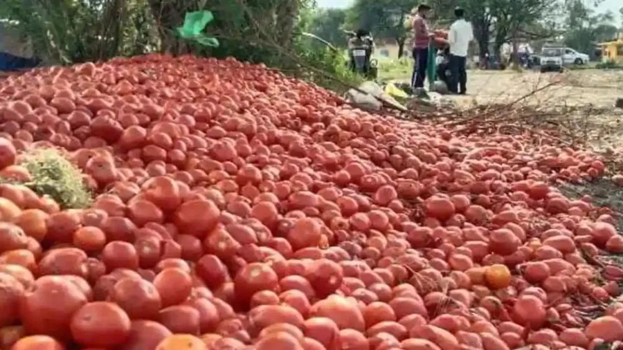 ટામેટાના બમ્પર ઉત્પાદન પછી તેની કિંમતોમાં ભારે ઘટાડો નોંધાયો છે. જેને લઇ ખેડૂતો પરેશાન છે. પુણેના બજારોમાં ટામેટાની કિંમત 5 રૂપિયા પ્રતિ કિલો સુધી પહોંચી ગઇ છે. નાસિકના પિંપલગામ, નાસિક અને લાસલગામની 3 મંડીઓમાં ટામેટાની સરેરાશ કિંમત પાછલા 6 અઠવાડિયામાં 2000 રૂપિયા પ્રતિ ક્રેટ(20 કિલો)થી ગગડીને 90 રૂપિયા થઇ ગઇ છે. કોલ્હાપુરમાં ટામેટા જથ્થાબંધ બજારોમાં 2-3 રૂ. પ્રતિ કિલોએ વેચવામાં આવી રહ્યા છે. જે લગભગ એક મહિના પહેલા 220 રૂપિયાની આસપાસ હતા.