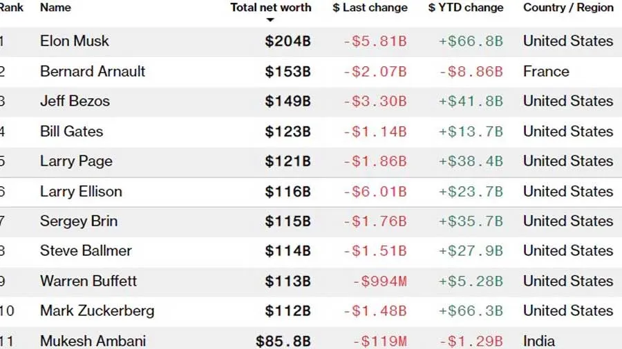 એવું જ નથી કે, દુનિયાના સૌથી ધનિક વ્યક્તિ એલોન મસ્કની સંપત્તિમાં ઘટાડો થયો છે. હકીકતમાં, વિશ્વના બીજા સૌથી ધનિક ફ્રેન્ચ અબજોપતિ બર્નાર્ડ આર્નોલ્ટને પણ શુક્રવારે 2.07 બિલિયન ડૉલરનું નુકસાન થયું હતું અને બર્નાર્ડ આર્નોલ્ટની કુલ સંપત્તિ ઘટીને 153 બિલિયન ડૉલર થઈ ગઈ હતી. આ સિવાય એમેઝોનના ફાઉન્ડર જેફ બેઝોસને 3.30 બિલિયન ડૉલરનું નુકસાન થયું છે, જે પછી જેફ બેઝોસની નેટવર્થ ઘટીને 149 બિલિયન ડૉલર થઈ ગઈ છે.