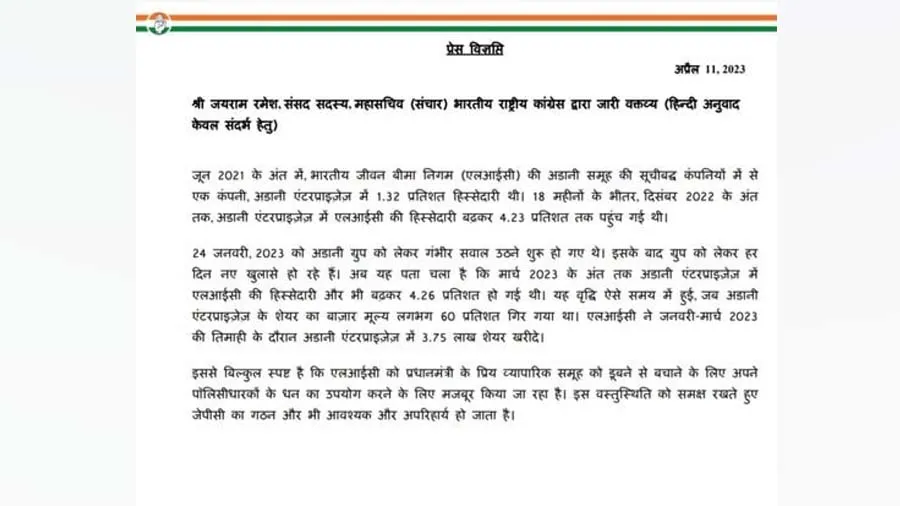 કોંગ્રેસ મહાસચિવે લખ્યુ કે 24 જાન્યુઆરી 2023ના દિવસે અદાણી ગ્રુપને લઇને હિંડનબર્ગના રિપોર્ટમાં ઉઠાવવામાં આવેલા સવાલો પછી દરરોજ નવા નવા ખુલાસાઓ બહાર આવી રહ્યા છે. જયરામ રમેશે કહ્યું કે, જૂન 2021માં અદાણી એન્ટ્રપ્રાઇઝીસમાં LICની હિસ્સેદારી માત્ર 1.32 ટક હતા અને 18 મહિનામાં ડિસેમ્બર 2022 આવતા સુધીમા આ હિસ્સેદારી 4.32 ટકા થઇ ગઇ હતી. LICએ જાન્યુઆરીથી માર્ચ 2023ના પ્રથમ ત્રિમાસિક ગાળામાં અદાણી ગ્રુપના 3.75 લાખ શેરો ખરીદ્યાછે.